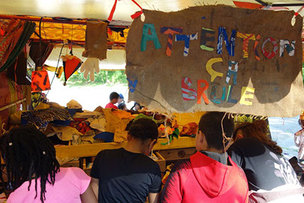 C'est une proposition foutraque de confection et de customisation de textiles au pistolet à colle à partir de tissus sérigraphiés, supervisé par des artistes.